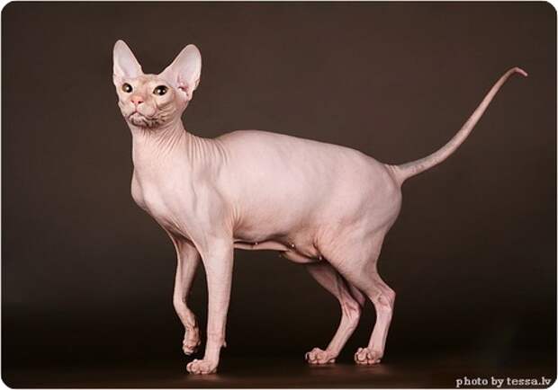 Голый сфинкс является особенным экзотическим существом. Ее изящная мордочка с глазами инопланетянина, увенчана огромными ушами, загривок как у жирафа, мягкий нежный животик как у маленького поросеночка, крысиный хвостик, лапки с пальчиками обезьянки с перепонками. Довершение картины – одеяние из мягкой кожи или замши на вырост, образующее множество складок. Сюрреалистический загадочный образ, не правда ли?